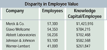 Why do their employees, in terms of knowledge capital valuations, show dramatically different valuations? What can explain the 544 percent difference between Merck & Co. and Warner-Lambert? Such a large disparity cannot be possibly explained by any other attribute that would show up on employees' resumes.