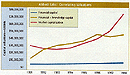 Particularly noteworthy is the significant disparity between market value and the calculated capitalization in 1998. I call this difference the market premium indicator, which at year-end of 1998 stood at +64 percent. The market also discounted the value of knowledge capital by -18, -19, -9 and 14 percent from 1993 through 1996. Since the financial capital during that period kept increasing, the conclusion must be that shareholders discounted the value of people, patents, brand names and market share for a four-year period.