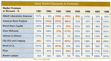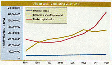 Formal methods of knowledge capital valuation make it possible to assess whether the stock market does or does not make a good estimate of a firm's knowledge capital. By comparing the market value (as quoted on stock exchanges) with the valuation of knowledge capital (as calculated from actual economic results), we can judge whether the marketplace is a reliable indicator. As a reminder, one can compute the knowledge capital of a firm by taking a year's worth of economic value-addedthe financial returns from assets that do not show up in financial reports (see "Calculating Knowledge Capital," Oct. `99 KMM). Using this approach, I was able to show that Abbott Laboratories had steadily grown its knowledge capital from $8.2 billion in 1991 to $39.5 billion in 1998 (a 382 percent growth). Meanwhile, financial capital grew from $3.2 billion in 1991 to $5.7 billion in 1998 (a 78 percent growth). Clearly, Abbott Laboratories enjoyed a period of substantial growth in its assets. The question before us is, how did all this growth get reflected in the prices of shares? Did the stock market recognize that much of the worth of Abbott Laboratories was in intangibles, or did it look more favorably on the accumulation of financial assets counted by the accountants, as reflected in reports to shareholders? To answer this question, let us examine eight years of recent history at Abbott Laboratories.